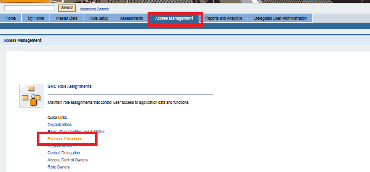 You must have a portal configured to use the SAP Process Control application. Log in as a business user to go to Figure 35. Business users perfom different tasks in the portal to which they are authorized. In my example, you, as a business user, have a dedicated portal assigned to your GRC system. In the screen shown in Figure 35, click the Access Management tab and then click the Business Processes link.