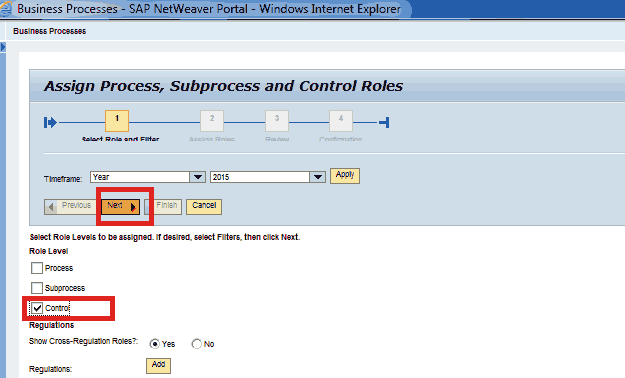 In the screen shown in Figure 36, select the Control check box and select the Yes radio button for Show Cross-Regulation Roles? Click the Next button.
