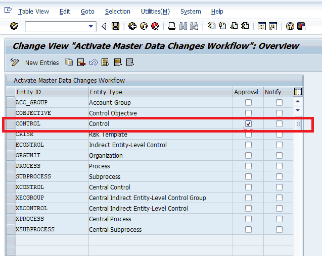 In Figure 38, you define Approval changes workflow for Control. In the row in which the control appears, select the check box under the Approval column. Then click the save icon.