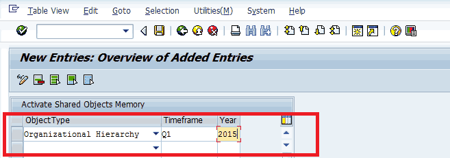 The shared object of master data is built by: Timeframe + object (e.g., Q1 + Organization). In the following example, you build shared memory for the first quarter for the organization hierarchy. The master data is a query via the period defined by the time frame.