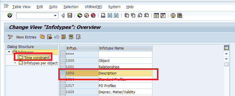 To understand this process, execute transaction code OOIT. This action opens the screen shown in Figure 41. Select the Time constraint folder. Select infotype 1002 and click the Time constraint folder again.