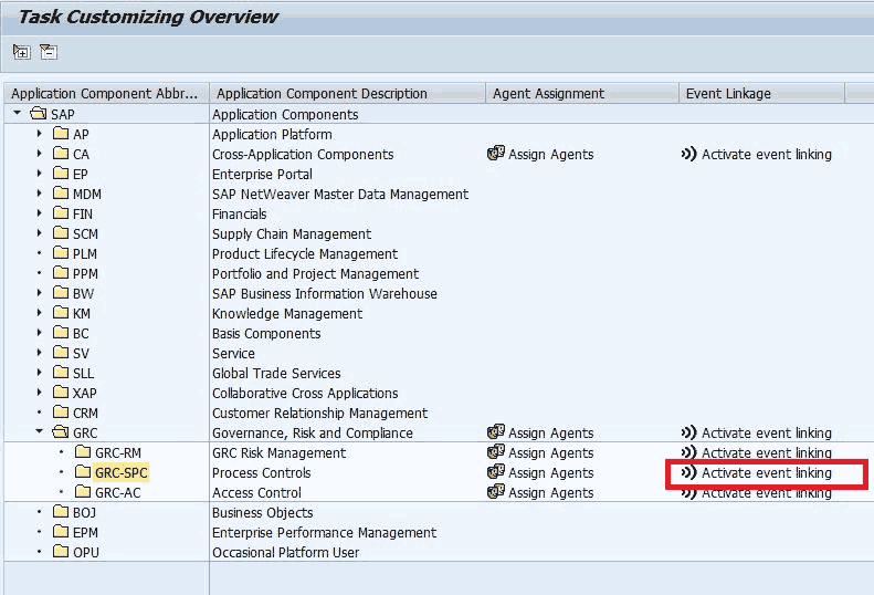 In the screen shown in Figure 44, from the hierarchy, expand the GRC folder, select the GRC-SPC subfolder, and click Activate event linking.