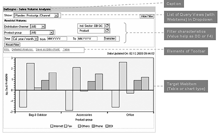 Two new SAP BW 3.5 Web items in Web Application Designer (Web AD) — Query View and Template — support the new UI Patterns. The Query View Web item provides for drop-down selection of tables or charts presented in the target display area at the bottom of a template (Figure 3).