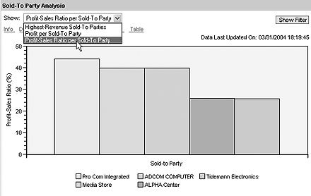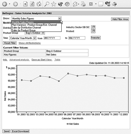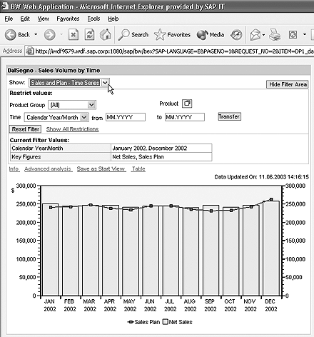 The system uses automatically generated SAP BW Web API and JavaScript calls behind the links on a report to affect output and launch new windows as needed (e.g., the Advanced option displays the BEx Web Analyzer with the currently selected view). These custom calls are transparent to Web template users and are used to toggle between the hide or show filtering options, the query view drop-down menu, and to select settings in the toolbar links such as Info, Detailed Analysis, Save as Entry Point, and Table. These elements are generally incorporated in the SAP-delivered 0TPLB_XXXXX pattern-based templates. An example of an ICP-based template from delivered content is shown in Figure 4.