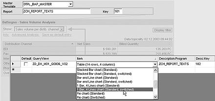 Select query views to populate the drop-down list (Figure 4). You can select the view in the QueryView column and choose from a variety of display formats in the Item column. These display types are stored in the Web item library 0LIB_BAP. Note that these items revert to their technical name once you exit the item field. The text descriptions are keys called from the ABAP texts report as shown in Figure 3.