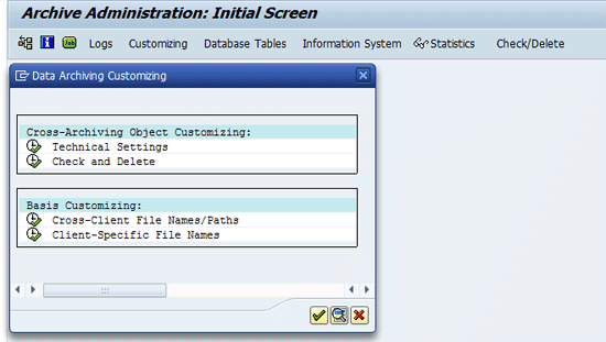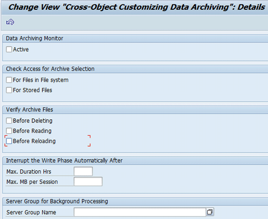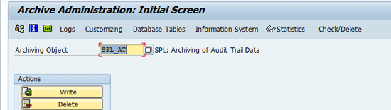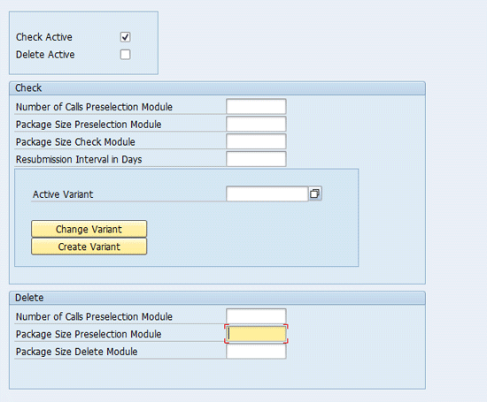 Press Enter after you populate the fields and check the boxes in Figure 12. Exit the screen and go back to the screen shown in Figure 11. Click the Check/Delete tab. This takes you to Figure 13. You then provide technical details in consultation with your Basis team for the fields shown in Figure 13, all of which need to be populated. Checking the Check Active check box makes the system check if the archival file has been prepared or not. Checking the Delete Active check box makes the system perform deletion of the data after checking for the generation of the archival file.