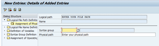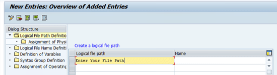 In this step you configure a file path. Start by clicking the execute icon beside the Cross-Client File Names /Paths in the Basis Customizing: section of the screen shown in Figure 11. In the screen that appears enter the name of a path and save it in the system by pressing Enter. Click the standard Save button (not shown in Figure 14). The file path refers to a folder that is created inside the SAP system. A file path specifies the path under which the archive files are stored. After you create the file path you need to assign it to a physical path (Figure 15). Once the name of the file path is saved, click the folder called Assignment of Physical Path, which takes you to Figure 15. A physical path is the external file share or an external folder outside the SAP system.