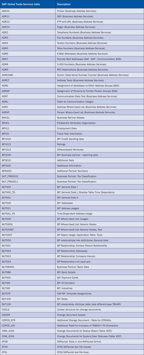 Click the Write button in Figure 3 to write the business partner data whose status is archivable to an archive file. The data in the archive file is stored in a folder or file share outside the SAP environment for audits or future reference after the Write function is complete. If you click the Delete button in Figure 3, the system deletes the business partners and their dependent data from the database. When the business partner’s data is archived from the SAP Global Trade Services system, the standard tables are affected, and data is archived. Table 1 shows the standard SAP Global Trade Services tables related to business partners. When a business partner’s data is archived from the system, the data is also deleted from these tables.