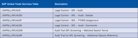 To write the archived data in a file click the Write button. To delete the sanctioned-party list audit trail data from the system database, click the Delete button. After you archive the sanctioned-party list audit trail data, from the system, some standard SAP Global Trade Services tables are affected. Data is archived from these tables (Table 3).