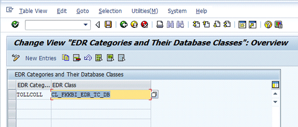 This EDR class includes reference to the three standard database tables for storing the EDRs in different statuses in the TOLLCOLL category. Before you create a custom EDR category, you need to create a corresponding custom class with the help of an ABAP developer. This custom class includes reference to the three custom tables required for storing the EDRs in this custom category. Note that the custom database tables of this new EDR category are based on the standard database tables of category TOLLCOLL.