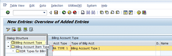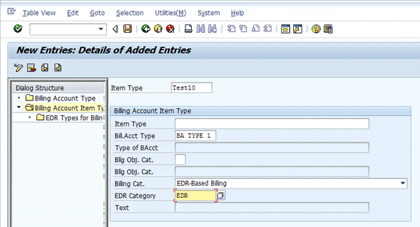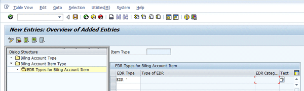 After you create a billing account type, create a billing account item type within the billing account type already created (Figure 6). Select the billing account type and then double-click Billing Account Item Type on the left. Once this step is done, enter the key data such as Item Type, Bill.Acct Type, Billing Cat. as EDR –Based Billing, and EDR Category as EDR in the next screen (Figure 7). Click the save icon.