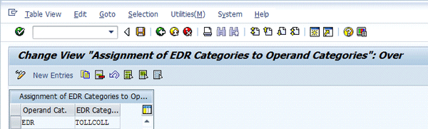 EDRs created by different external rating systems may have varied technical attributes depending on the application in which they are created. These attributes include amount, time of origin, and billing objects. EDR management in an SAP system allows grouping these installation-specific EDRs that have similar attributes into specific categories, thus making them available for billing and invoicing. A category of an EDR includes database tables containing fields that are required for billing. SAP provides a standard EDR category, TOLLCOLL, to transfer EDRs from an external rating system for billing toll charges. You also can enhance existing categories or define new custom EDR categories in a customer namespace to transfer EDRs having significantly different attributes.