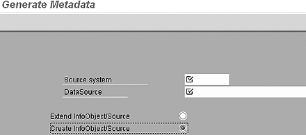 Metadata for the classification characteristics also can be generated by the system. This saves BW developers a lot of time because they do not have to develop each InfoObject manually. InfoObjects are created automatically using metadata and links to the DataSources for these InfoObjects are also established automatically. To do this, log on to the BW system and go to transaction CTBW_META. Check the Source system and the DataSource boxes, set the Create InfoObjects/Source, and press enter (Figure 8).