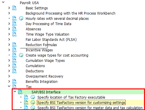 Navigate to the following locations in the IMG by following menu path Payroll > Payroll: USA > Tax > SAP/BSI Interface > Specify BSI TaxFactory version for customizing settings and Specify BSI TaxFactory version for master data and tax calculation (Figure 4).