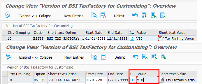 For the IMG activity Specify BSI TaxFactory version for master data and tax calculation you need to update this to use version 10.0. Change the value in the table from 90 to 10 as seen in Figure 6. Once you’ve made these changes, click the activate icon