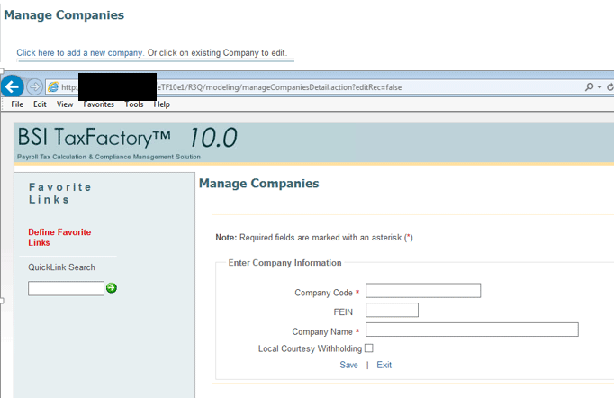 Enter the Company Code, FEIN (Federal employer ID number), and Company Name and click the Save button to save your changes. With that last click you have created the link between the SAP system and BSI for this tax company. Repeat these steps as needed for any additional tax companies.