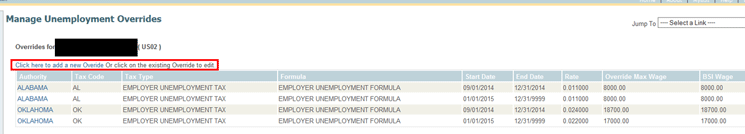 First, you need to log on to BSI (Figure 11), and then navigate to the Manage Unemployment Overrides section using the Jump To options. This brings you to the screen shown in Figure 14 where you can select the company code to create a necessary override.