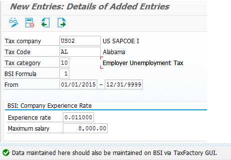 In the figure, you see that when you update this table there is a message that says Data maintained here should also be maintained on BSI via TaxFactory GUI. The reason for these dual entries is that the data for the BSI TaxFactory tables is not stored anywhere in the SAP system, but it is needed in the SAP system. The BSI entry is used during the payroll run when the BSI interface is called via an RFC, and this rate is also needed for the tax reporter transaction which does not have a connection with BSI to check the rate. As a result, the tax reporter uses the entry that is maintained directly in SAP.