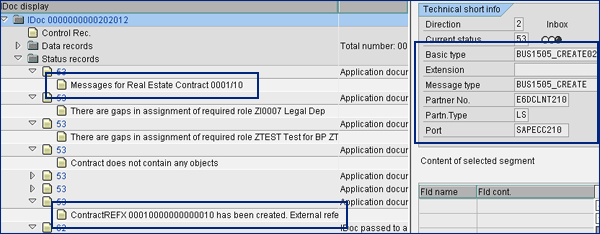 Figure 27 displays the real estate contract (e.g., 0001/10) details created with IDoc 202012. You can see the technical details on the right side of the IDoc record.