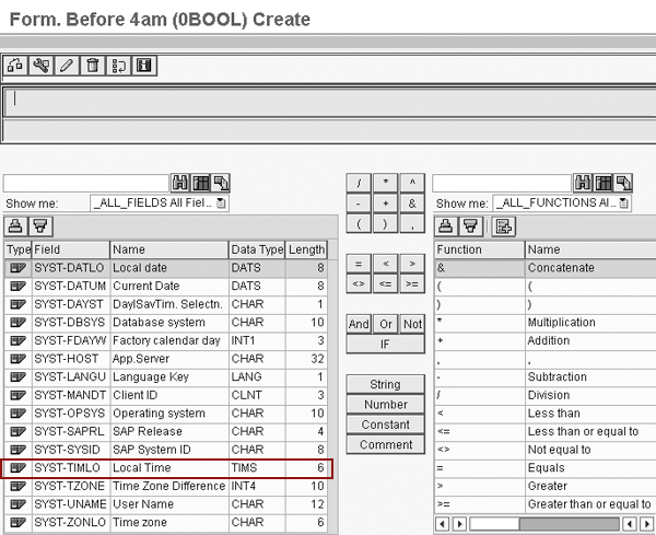 If you have used the transformation library, Figure 3 might look familiar. In this screen, you create a Boolean formula to evaluate if the system time is before 4:00 am. On the lower-left side of the screen, you can see system variables that you can use to create the Boolean formula. In this example, select SYST-TIMLO (Local Time). Double-click on the variable and it appears in the formula builder. Click on the < operand, and then click on Constant. In the pop-up screen that appears, enter 04:00:00, which corresponds to 4:00 am. When that’s complete, you should have a formula that looks like the one in Figure 4.