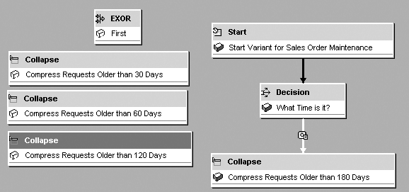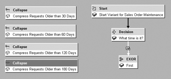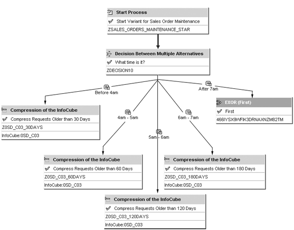 With this variability, it does not make sense to schedule compressions or other incremental maintenance at the end of the process chain. Instead, you can use Decision Between Multiple Alternatives to determine whether or not certain activities should take place.