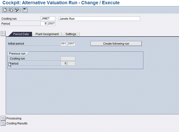 The next thing to be aware of is that you can create a chain of alternative valuation runs by entering the previous valuation run and double-clicking on the Create following run button. You don’t necessarily need to do this in testing, but in a productive environment, it ensures that the ending inventory recorded by the first run is written to the following run as the beginning inventory. If you do not enter a previous run, then the system uses the beginning inventory of the first period you include in the valuation run as its starting point.