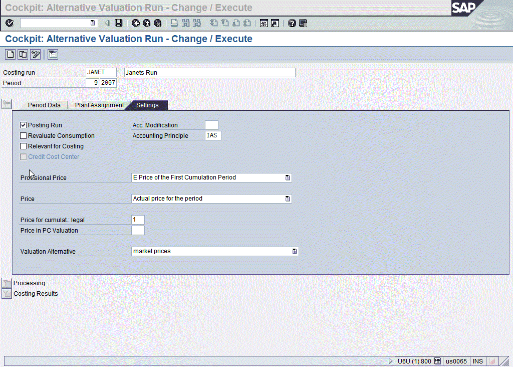 Double-click on the Settings tab to enter the system settings for your alternative valuation run (Figure 4). You should only make entries in this tab after you have completed the entries under Period Data and Plant Assignment, because the checks that the system performs are dependent on the periods and plants entered in these screens.