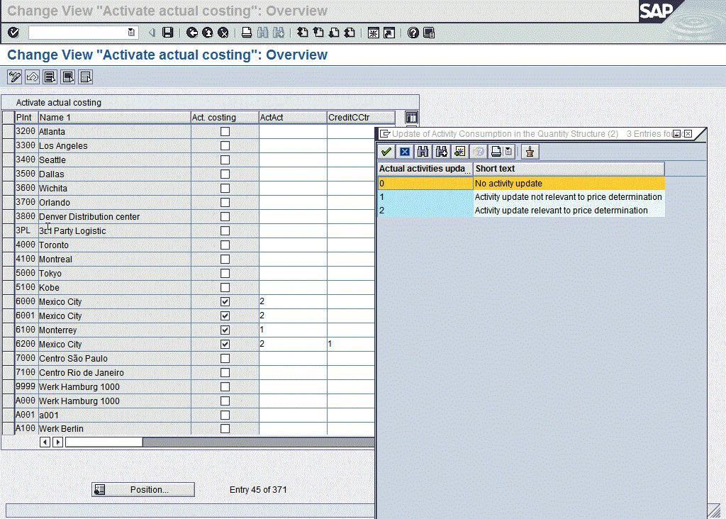 In my example, for the plant in Mexico City (plant 6000), the flag 2 (Activity update relevant to price determination) has been set in the ActAct (actual activity) column but there is no entry in the CreditCCtr (credit cost center) column. To credit the cost centers using the alternative valuation run, you would have to enter a 1 (credit cost centers using alternative valuation run) in this column. This means that the costing run subsequently posts any difference between the planned activity rate and the actual activity rate.