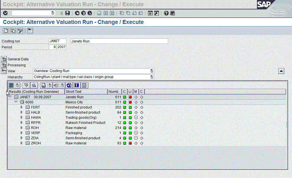 Now that you have maintained all the basic data for the alternative valuation run, save the costing run and select the Processing folder to initiate each of the steps in the costing run. You can see the steps involved in Figure 8. As you proceed, the system updates how many materials it has processed and how many are still open for each step.