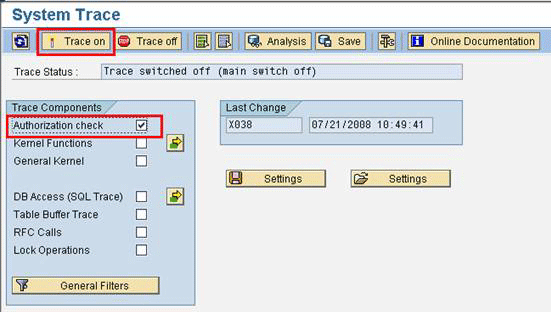 Authorization trace is a useful tool that can answer the above question. Authorization trace tracks down all the authorizations being checked in a transaction and provides a full list of all those authorization objects. You can use transaction code ST01 or follow menu path SAP menu > Tools > Administration > Monitor > Traces > System Trace for authorization trace (Figure 3). Select the Authorization check check box and click on the Trace on button.