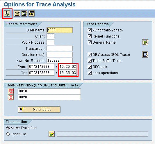 Then execute the transaction that you want to trace on a separate screen. In this example, I run transaction VF44 (revenue recognition). Transaction VF44 recognizes the deferred revenue systematically and automatically by posting a credit to the revenue account and debit to the deferred revenue account. Revenue recognition is a good example because it is not a commonly used functionality, and thus, you need to use authorization trace to track down the detailed authorization check of it. After you execute the transaction, go back to the authorization trace screen and click on the Trace off button. Then click on the Analysis button to display the authorization trace result. Specify the time interval (i.e., the time when you are executing transaction code VF44) you want to display for the authorization trace, and click on the execute icon (Figure 4). In transaction ST01, sometimes the system doesn’t refresh automatically to the time interval when you execute a transaction. That’s why you need to specify the time interval.