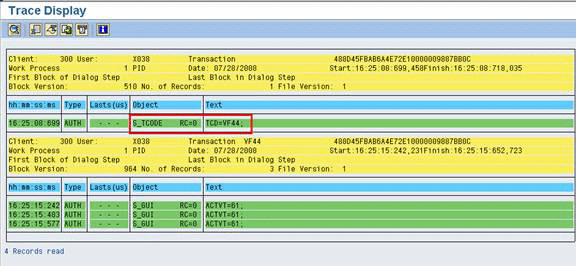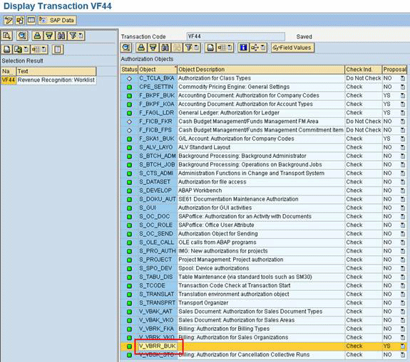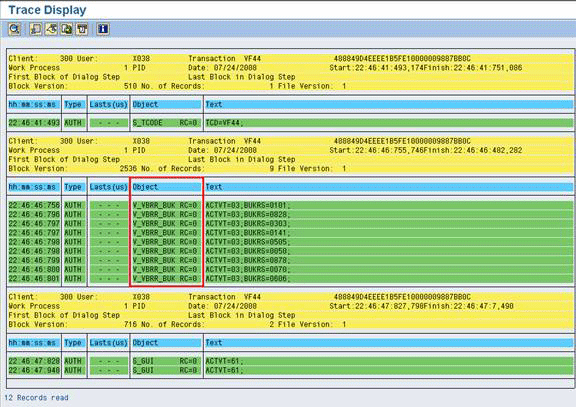 SAP Note 1055696 provides a solution to this problem. This SAP Note creates a new authorization object and inserts that in transaction VF44. After you implement this SAP Note, the authorization trace now shows that transaction VF44 is checking the authorization for company code in the Object column using authorization object V_VBRR_BUK revenue recognition by company code (Figure 6).