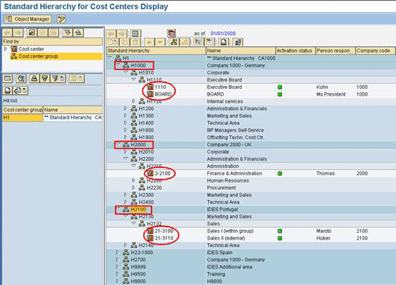Figure 9 shows a typical cost center standard hierarchy. The hierarchy node enclosed within a box is the top node for all the cost centers within a company code (e.g., company code 1000). Those cost centers circled with a circle are the actual cost centers in that company code (e.g., 1110). Using authorization object K_CCA, you don’t need to maintain each cost center value one by one as you did with K_REPO_CCA (Figure 10). For K_CCA, maintain the node in the authorization value field responsibility area (RESPAREA). For K_REPO_CCA, you need to maintain the cost center value one by one in the authorization value field cost center (KOSTL). This shows that K_CCA is more flexible. For example, if a new cost center is created in the future, you don’t need to update the authorization value using K_CCA because the hierarchy node remains the same.