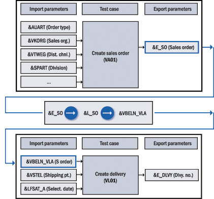 Export parameters: The results of the test case (e.g., sales order number 1000123 created) are passed to the export parameters.