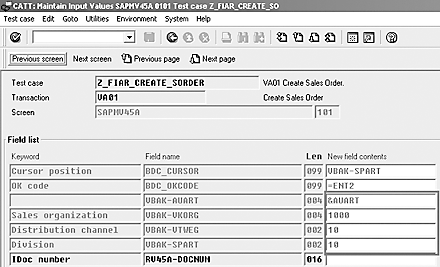 Step 1. Create a test case for creating a sales order. Use transaction code SCAT to create a test case Z_FIAR_CREATE_SORDER. Use the record transaction icon to record transaction VA01. Follow the R/3 screens and enter appropriate values. When you save the sales order transaction, stop the recording. The system then generates the recording and a basic test case is created (Figure 2).
