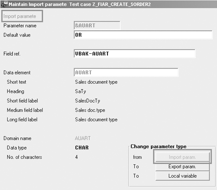 Because the user enters the order type field as an input, the system automatically makes this parameter (&AUART) an import parameter as shown in Figure 5.