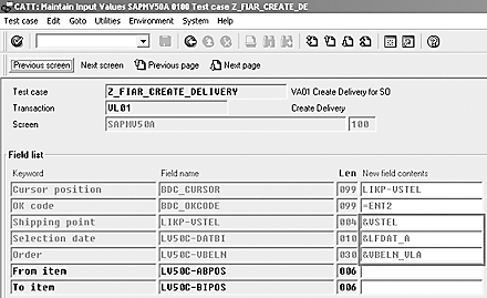 Step 2. Create a test case for creating a delivery. Create a test case with transaction VL01 and parameterize the field's values as shown in Figure 7. The process is similar to the process for creating a test case for create sales order.