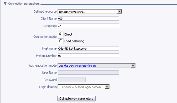 Step 4. In the next screen, provide the details from your SAP NetWeaver BW system (Figure 15). Select JCO.SAP.NETWEAVERBI as the Defined resource. Enter the system details for your SAP NetWeaver BW system. Set the Authentication mode to the option Use the Data Federator logon.
