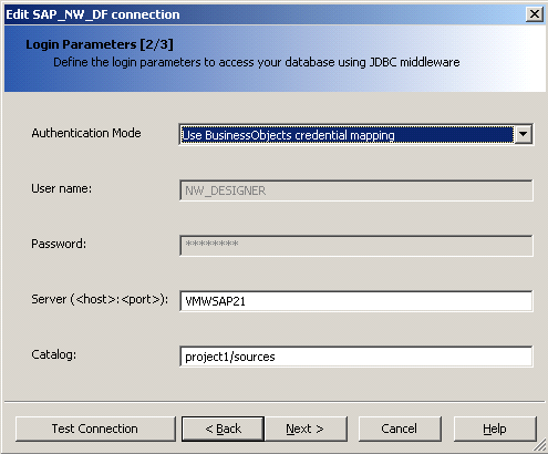 For the Authentication Mode, you can choose between the Use specified username and password option or the Use BusinessObjects credential mapping option. In this example you want to configure the connection with SAP BusinessObjects credential mapping, so you need to log on to the Universe Designer with the SAP BusinessObjects Enterprise credentials in place.