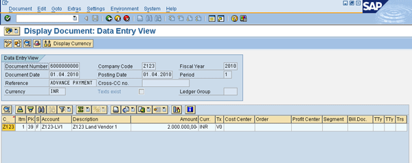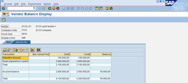 Upon completion of the work, the vendor or contractor submits a final invoice. Posting the final invoice completes the down payment chain by reversing the down payment and retention amounts, showing the balance payment, if any, to the vendor or contractor. Assume that in my example that vendor Z123-LV1 has submitted a final invoice for INR 550,000. To post the final invoice, click the Posting button or choose Edit > Posting from the Display Credit-Side Down Payment Chain screen.