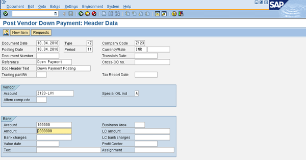 Now you need to post the advance payment against the request created in step 1. Use transaction F-48 or follow menu path Accounting > Financial Accounting > Accounts Payable > Document Entry > Down Payment > Down Payment (Figure 17). Enter the following details: