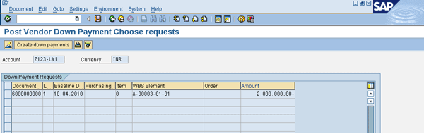 After entering the data, click the Requests button to select the required down payment request. Select the required request and click the Create down payments button to create the down payment (Figure 18). The system posts the document debiting the vendor and crediting the bank (Figure 19).