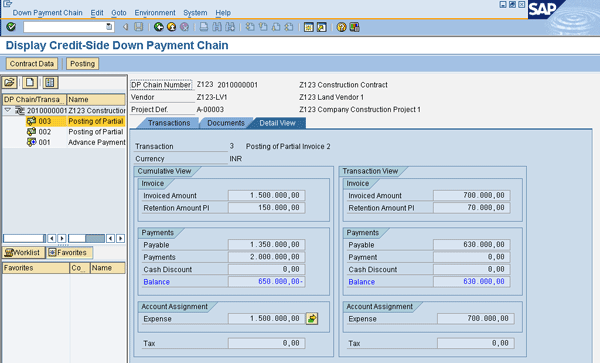 The processing screen for either debit-side or credit-side down payment chains includes the screen area DP Chain Structure, which contains the details of the down payment chain number, customer or vendor, and the project. The work area is where the actual transaction data is posted, and the Worklist and Favorites sections facilitate the creation of further down payment chains.