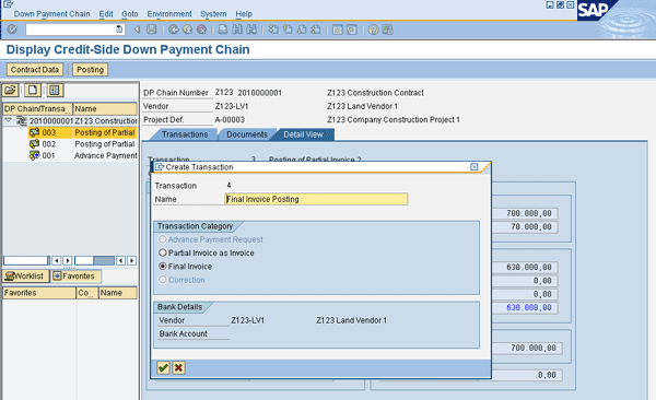 Long-term business projects — the construction of a new building, for example — can span years. Different business transactions involving multiple business partners (e.g., raising partial invoices, partial payments, retention amounts, and additional costs) accumulate and become a challenge to manage. SAP’s down payment chain functionality helps you track these events.