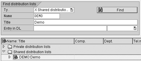 Make sure that you select Shared distribution list in the type (Ty.) field (Figure 3). A private distribution list is available only under your ID. Enter the short name (eight digits in the Name field) and the long text for the distribution list title (in the Title field). After creating the title, click on the create icon.