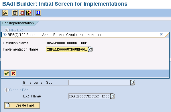 The HR module has one BAdI (HRALE000UTBOUND_IDOC) that was designed for a custom filter implementation. In my example, I’m filtering on the basis of an employee’s company code. First, I need to get the company code from the employee’s record and assign it to the filter’s variable. Once you start the BAdI implementation with transaction SE19, specify the BAdI name HRALE000UTBOUND_IDOC inside the Classic BAdI parameter (Figure 5). Click on the Create Impl. button and enter the implementation name, which needs to begin with a standard SAP custom object (i.e., with a Z or Y) in the Implementation Name field.
