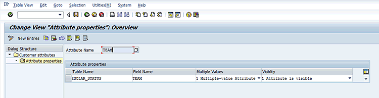 Figure 1 shows the screen where the TEAM attribute already exists in the system. It was created by clicking the New Entries button and entering the attribute name and description. Selecting the TEAM attribute and double-clicking the Attribute properties folder on the left side of the screen takes you to the details of the TEAM attribute shown in