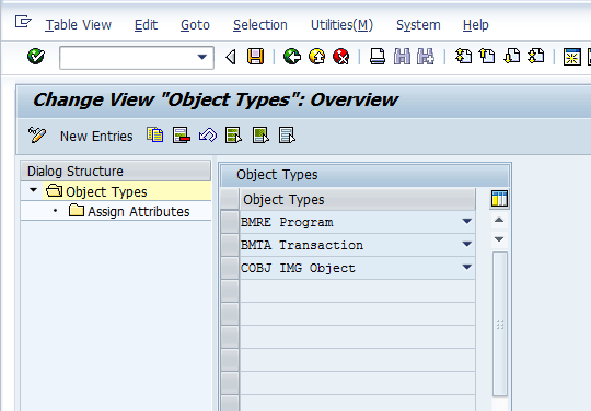 Figure 3 shows the object types overview maintenance screen. You can see that three objects already have customer attributes assigned to them: BMRE Program, BMTA Transaction, and COBJ IMG Object. Solution Manager presents this as an empty table if this is the first time you’re using this feature.