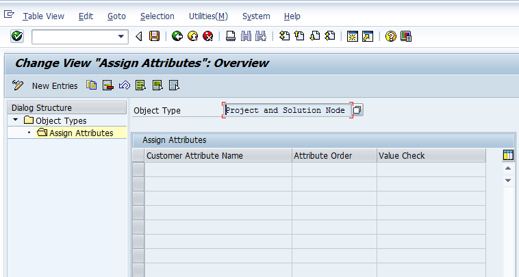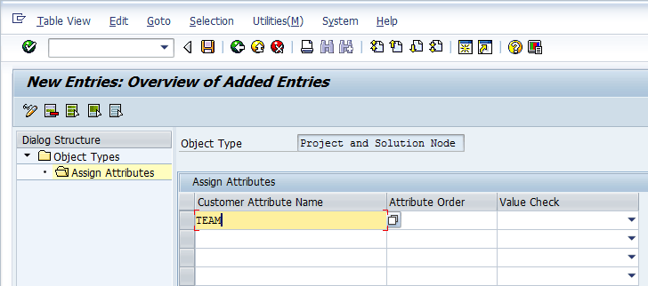 to save the new entry and assign the configuration to a transport if prompted to do so. The last step is to assign the customer attribute to a PNOD – Project and Solution Node object. Select the new row just entered into the table (PNOD) and double-click the Assign Attributes folder on the left side of the screen shown in