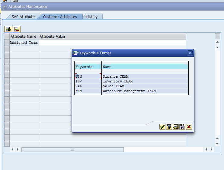 Click the Customer Attributes tab to see the TEAM attribute just configured. Using the drop-down option (F4) choose a value from the list by double-clicking it.